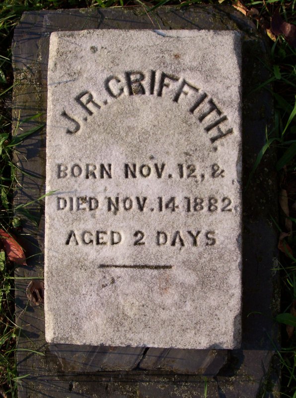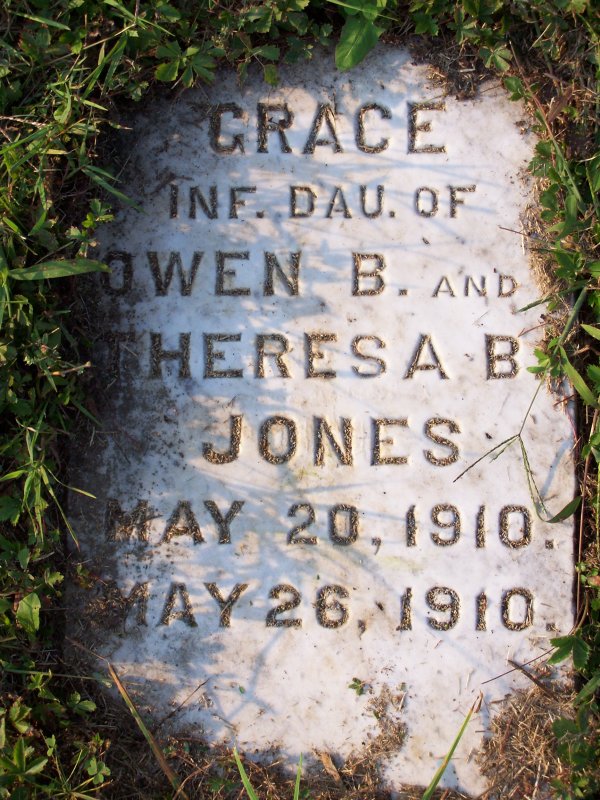 Jones, Grace infant daughter of Owen B. and Theresa B. Jones 20 MAY 1910 - 26 MAY 1910. Jones, Robert O. son of Rev. M.H. & Mary R. Jones. died 14 MAR 1892, aged 8y4m3d.