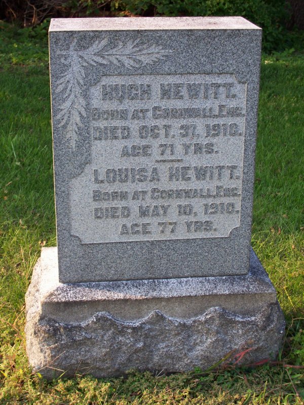Hewitt, Hugh Born at Cornwall, England, died 31 OCT 1910, age 71 years,
