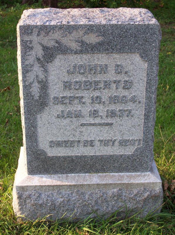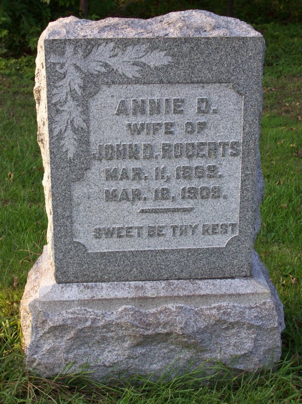 Roberts, Annie D. wife of John D. Roberts 11 MAR 1889 - 18? MAR 1909.